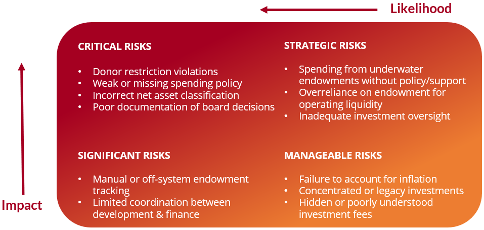 Critical risks related to endowments primarily stem from misunderstandings or violations of donor restrictions. These include: